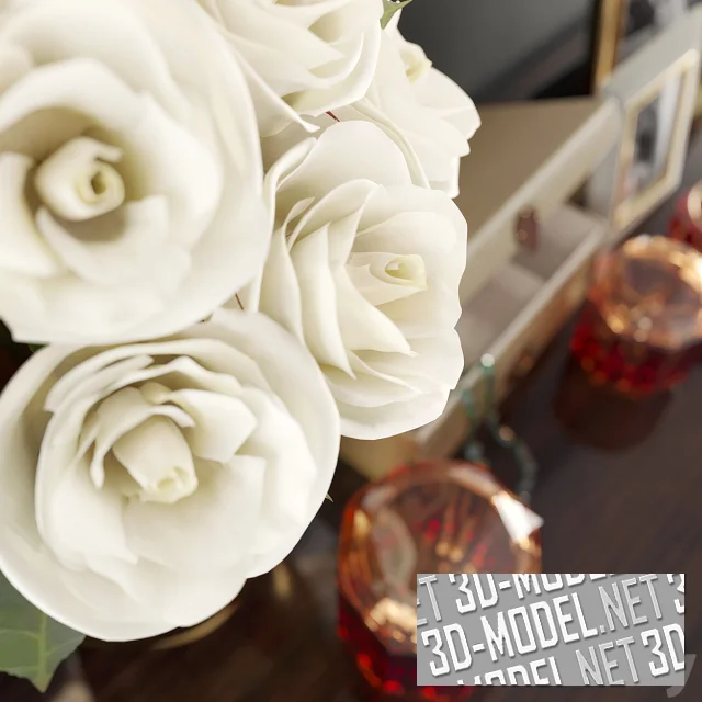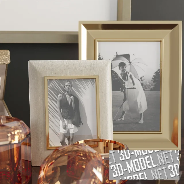 Набор декоративных аксессуаров от компании Ralph Lauren. Фотопортрет Мэрилин Монро в изысканной позолоченной раме занимает центральное композиционное место. В комплект входят две фотографии других знаменитостей, сундук на замке для украшений. Освежает сет букет белых роз в роскошной позолоченной вазе.