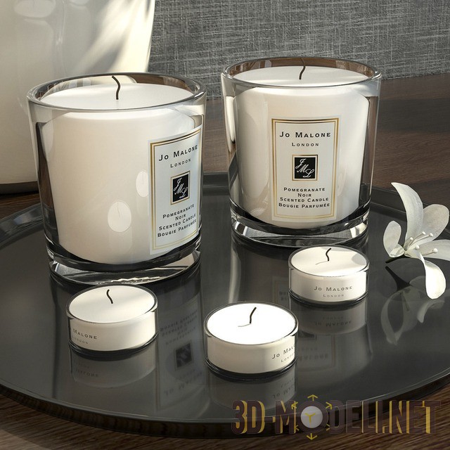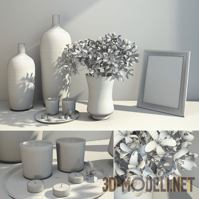 3D модель красивого декоративного набора с белыми цветами, вазами, свечами и картиной. Особенности модели: