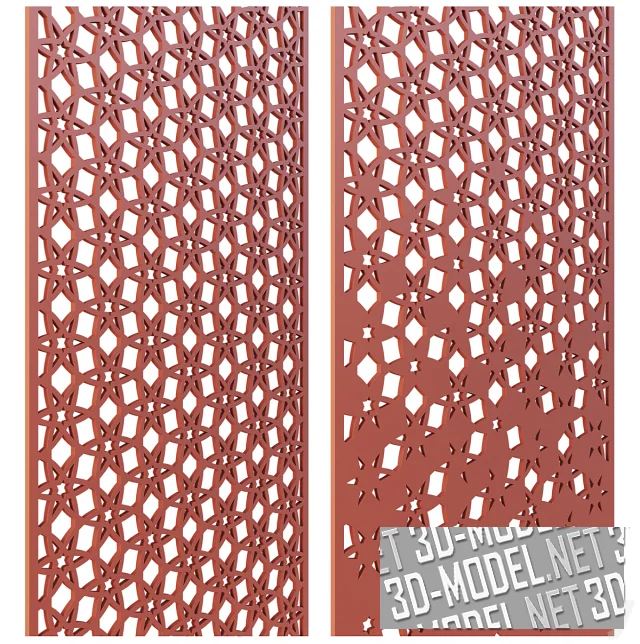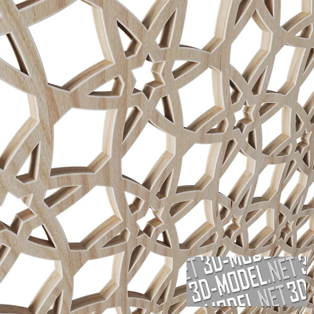 Прямоугольная деревянная резная решетка-перегородка. Габарит: 133,2х62,4х0,86см. Прорезной орнамент представлен в двух вариантах. Первый - паттерн из пересекающихся кругов и шестилучевых звезд. Во второй решетке некоторые элементы паттерна не прорезаны, что создает интересный декоративный эффект. Отделка панелей тоже представлена в двух вариантах - из светлого дерева с белыми кромками и темно-красном цвете.