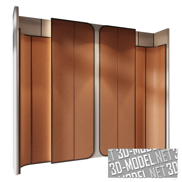 Современная стеновая панель с отделкой под кожу. Выполнена из материала с выраженной текстурой, имитирующей мягкую кожу теплого коричневого или терракотового цвета. Роскошный вид позволяет использовать элемент в элитных интерьерах или для отделки кабин лифтов. Панель поделена на вертикальные секции с закругленными углами и черной окантовкой по периметру и между секциями.