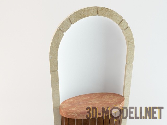Интересная ниша, которая находится в арке из туфовых блоков. Внизу предусмотрена поверхность из деревянных реек темного цвета, с мраморной красной столешницей, которая может служить столиком, тумбой, барной стойкой. 3D модель со всеми текстурами в архиве.