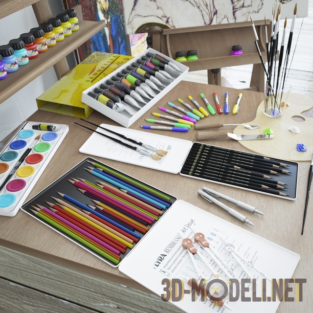 3d-модель художественного набора, в комплекте с мольбертом. В сцене присутствует все, что может понадобиться для мастерской художника или декора комнаты. Это карандаши, кисти, краски, палитра, мольберт, картина и пр. Модель сделана очень качественно, все текстуры присутствуют.