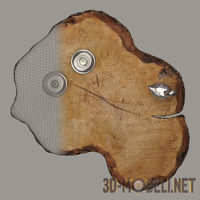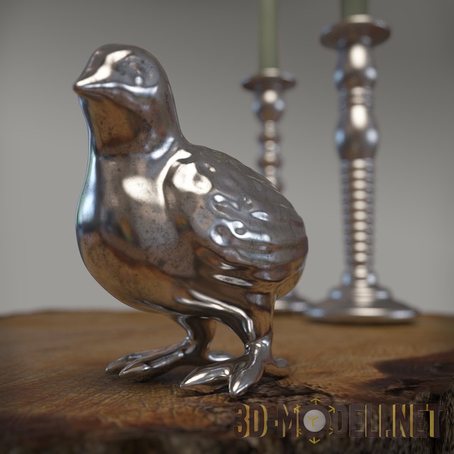 3D модель декоративного набора с птицей и свечами. Основа композиции состоит из низенького стола, сделанного из толстого бесформенного куска спиленного ствола с грубой коричневой корой по периметру. Конкретный рустик поверхности стола органично сочетается с небольшими металлическими круглыми ножками и двумя высокими металлическими витыми подсвечниками с белыми свечами. Маленькая фигурка металлической птички завершает комплект.