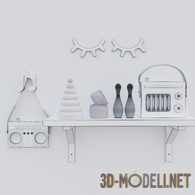 3D модель толстой белой полки, на которой стоит деревянная детская пирамида, кегли, радиоприемник. Все это веселого, рыжевато-коричневого цвета и сделано в скандинавском стиле, который всегда актуален. Формат модели: 3ds max 2011, obj, fbx. Render: Corona. Текстуры есть.