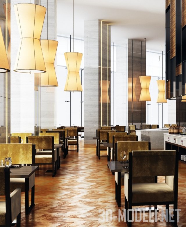 Полная 3д-сцена интерьера современного кафе с высокими потолками, оформленного в теплых тонах. В комплекте все текстуры