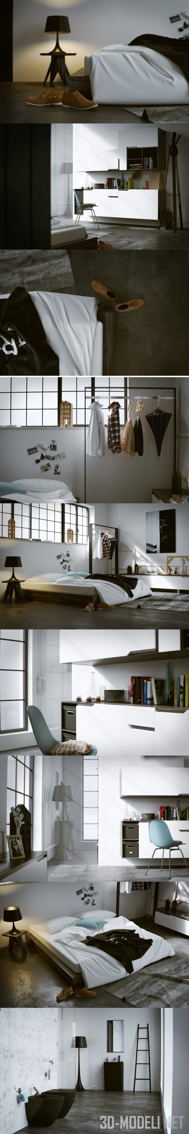 Полноценная квартира с современным минималистским дизайном, отлично подойдет для молодого мужчины. В пространстве предусмотрены все необходимые элементы мебели и декора – кровать, рабочее место, стойка с одеждой, санузел с унитазом, биде, раковиной, душем, светильники и пр. Реалистично и качественно выполненная 3d модель. Все текстуры собраны в архиве.