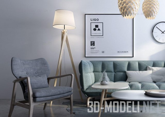 Сцена для формирования современного интерьера гостиной, с нотками Скандинавского стиля. В комплекте диван, кресло, журнальный столик с двойной столешницей, шкафчик. Торшер на треноге и подвесные светильники продолжают тему натурального дерева, и гармонично вписываются в набор. Декоративные элементы (вазы, часы, ковер) вносят завершающий штрих.