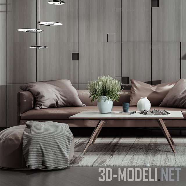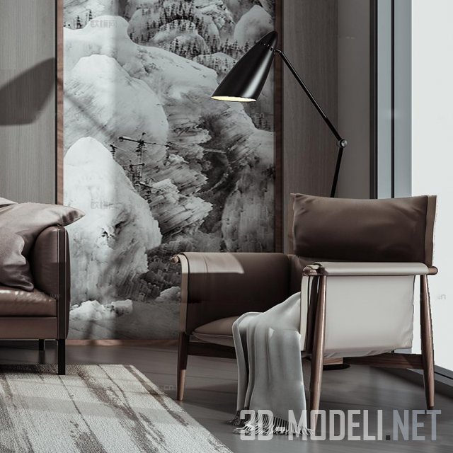 Универсальный интерьер современной гостиной, выполненный в спокойной цветовой гамме. Диван и кресло в отделке из коричневой кожи прекрасно гармонируют с серыми акцентами в дизайне (ковер, дерево, панно). Контрастность вносят светильники.