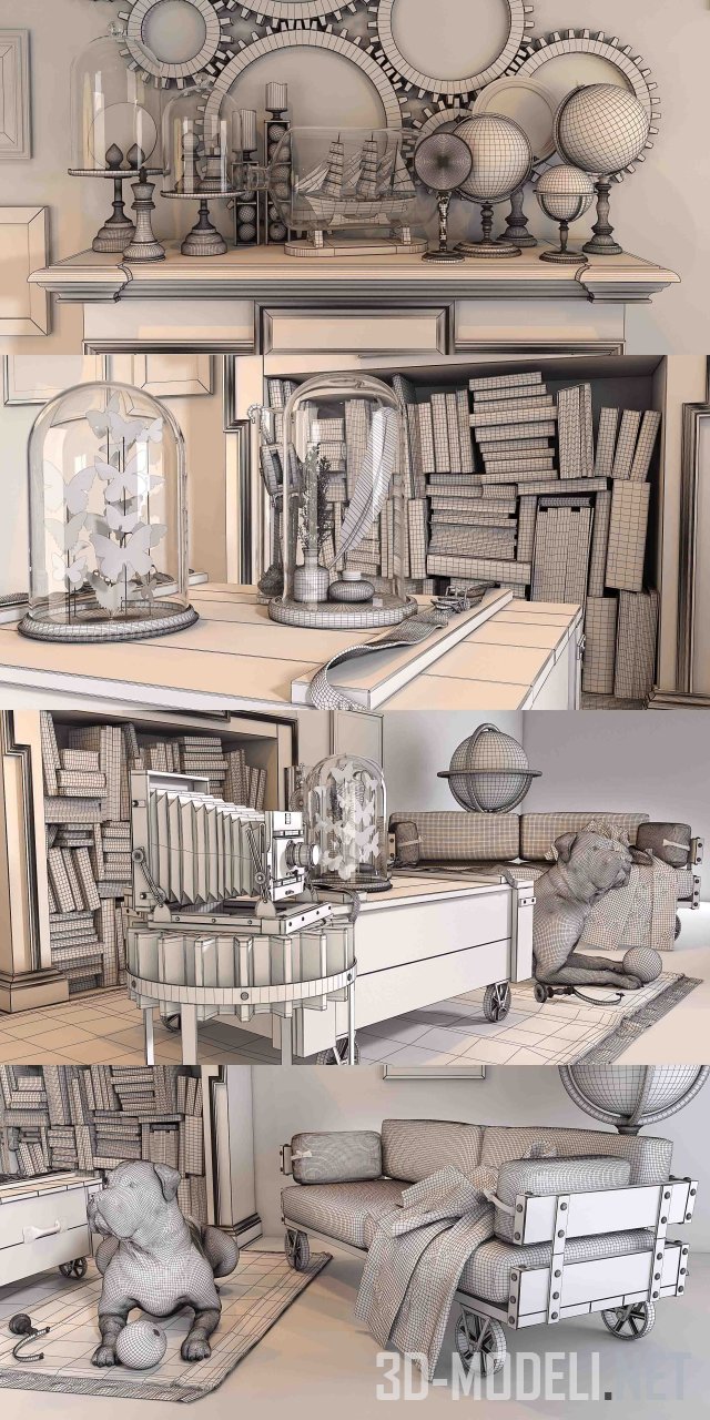 Декоративный набор Loft, полноценная сцена, которая содержит все декоры (книги, рамы, глобус), мебель и светильники, а также собаку, ковер и стену.