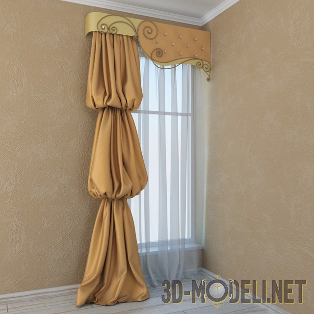 3d-модель изящной угловой шторы. Это штора с бандо, изготовленного с применением техники ажура. Жесткий ламбрекен сделан из жгута, украшен стразами Swarovski. Такая изящная штора отлично подойдет для оформления угловых окон, придав им уют и законченность.