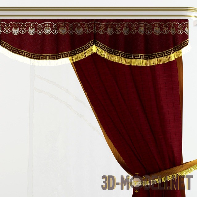 Темно-красные бархатные шторы с золотистыми меандрами по нижней кромке ламбрекена. По верхней части ламбрекена идёт растительный орнамент в стиле ампир. Полотна прямых штор подхвачены и раздвинуты золотистыми лентами с бахромой. По нижней кромке ламбрекена тоже идёт бахрома. Карниз украшен широким, белым с золотом, багетом, с закругленными боками.