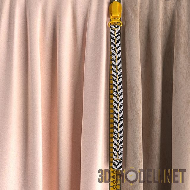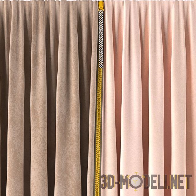 Очень красивый трехцветный комплект штор. Справа и слева висят шторы цвета молочного шоколада из мягкой велюровой ткани, рядом с ними шелковистые персиковые шторы и посередине помещена белоснежная гардина из тюли, свисающая густыми бантовыми складками. Между шоколадными и персиковыми шторами с обеих сторон предусмотрены сверху до пола тонкие декоративные замки золотисто-желтого цвета.