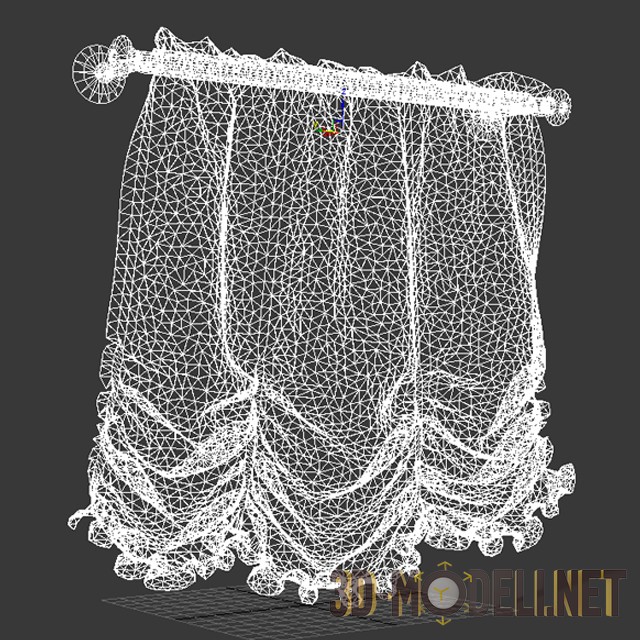 Небольшая кухонная штора в стиле кантри. Снизу полотно подобрано тремя стяжками, образующими три полукруга снизу, декорированные красно–коричневыми рюшами. Штора сшита из ткани в мелкую красную клетку. Металлический карниз золотистого цвета декорирован круглыми концевиками.