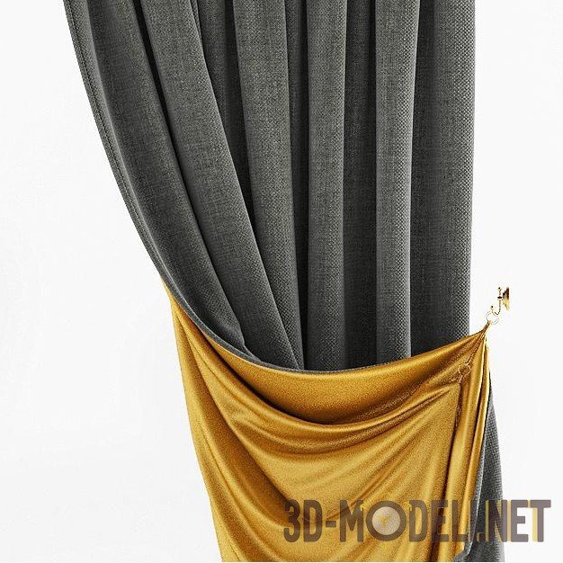 Комплект тяжёлых штор из серой крупнотекстурной ткани с золотистым подбоем. Нижние внутренние углы полотен отвёрнуты наружу и подвешены за декоративные золотистые крючки.