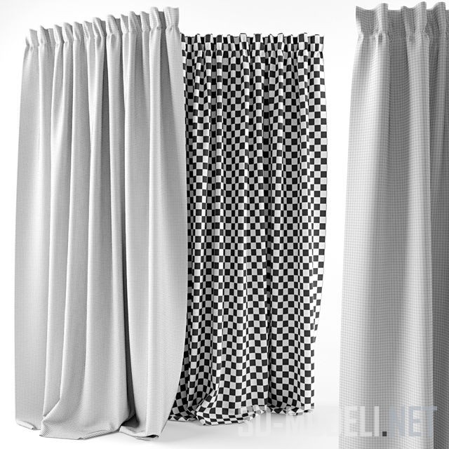 Три шторы из льняного полотна, натурального (серовато–фисташкового) цвета. Одно из полотен – без орнаментов, однотонное. Второе по вертикальной кромке украшено меандром, более темного тона. Третье полотно украшает этнический паттерн.