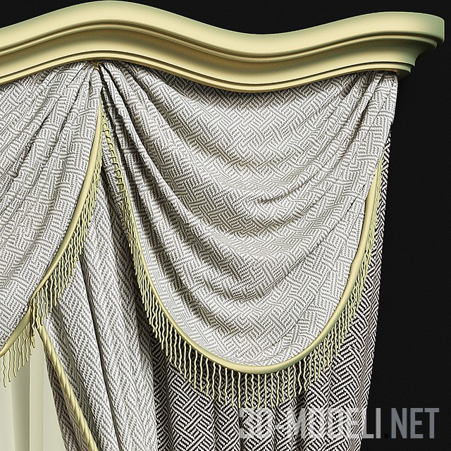 Комплект штор в классическом стиле. Шторы сшиты из нескольких слоев. Карниз выполнен в виде золотистого волнистого багета. Ламбрекен из нескольких волн со складками оторочен золотистой бахромой. Полотна штор изготовлены из четырех пар полотен с мелкой текстурой в бело–коричневую полоску. Пары полотен скручены между собой и декорированы золотистым шнуром по вертикальной кромке. Гардины однотонные, с легким желтоватым оттенком.