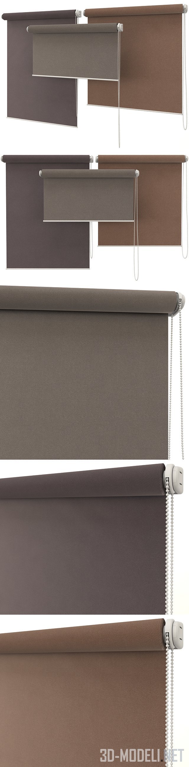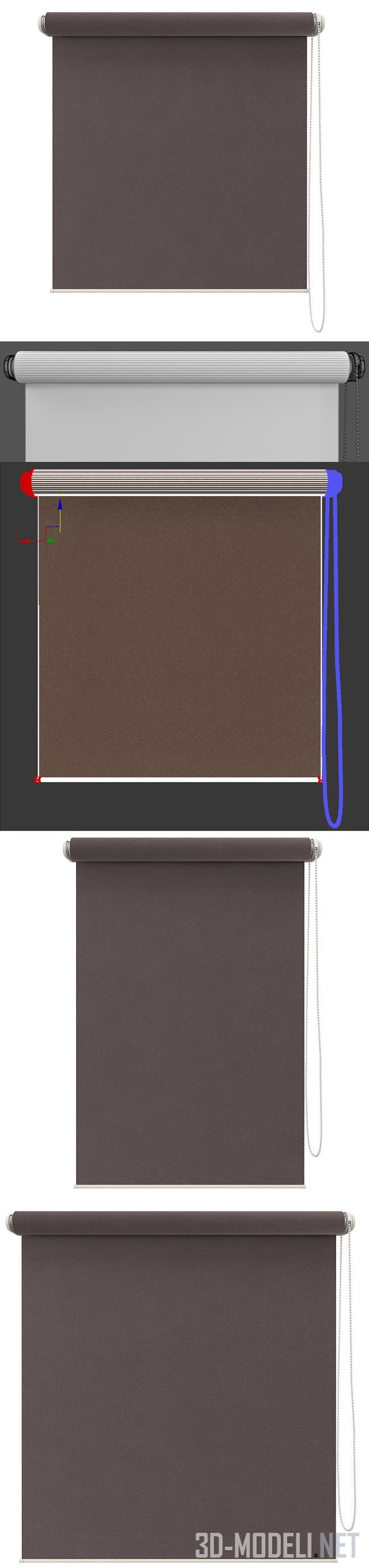 Три рулонные шторы красивого шоколадного цвета (для 3d модели представлены 3 вида материала), находящиеся в разных положениях, с регулируемыми размерами по ширине и длине.