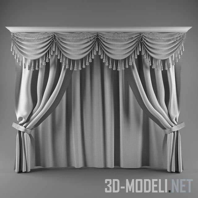 Комплект штор для обрамления окна в классическом интерьере. Спокойное сочетание жемчужно-серого и бледной умбры в тканях комплекта с обильно украшенным ламбрекеном создают изысканный ансамбль. Белый деревянный багет с фигурным профилем перекликается с белым шелком гардинного полотна.