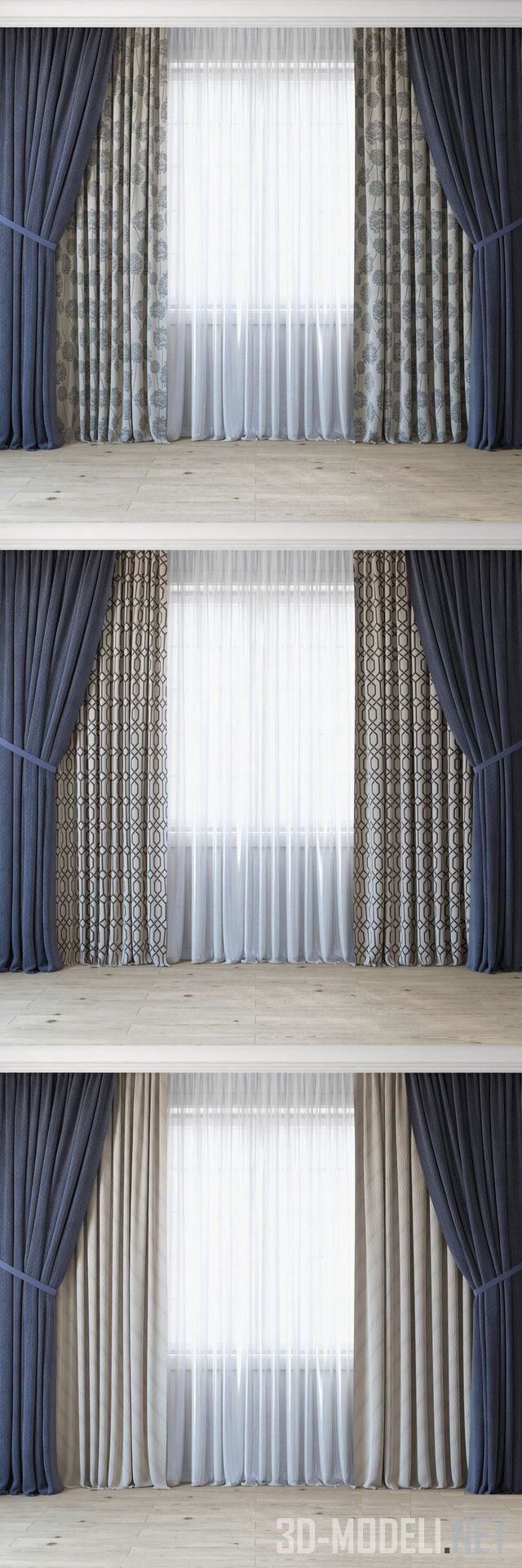 Комплект из четырех плотных штор, свисающих густыми красивыми мягкими складками по обеим сторонам от белой тюлевой гардины. Три различных материала. Сосновый паркет (состоит из модуля примерно 6 х 8 м, легко стыкуется по длине и ширине). Все текстуры есть.