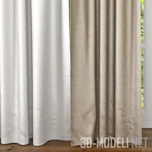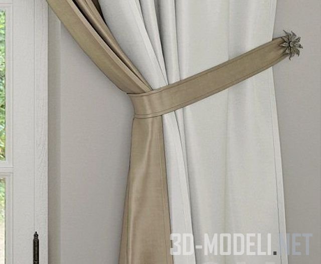 Универсальный комплект для оформления окна как в современном, так и классическом интерьере: изящные шторы в мягкой цветовой гамме, прямые и с подхватом. Реалистичная и качественная 3D-модель.