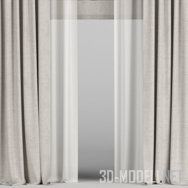 Универсальный комплект штор – портьеры бежевого цвета, тюль и римская штора. Сдержанный дизайн и бежевый (и белый) цвет штор позволяет использовать их в любом интерьере. 3d модель выполнена реалистично, текстуры и материалы присутствуют.
