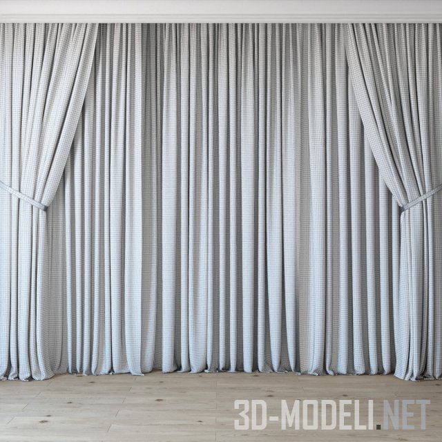 Очень элегантный комплект штор для оформление окна. Белоснежная тюлевая гардина традиционно в центре, с двух сторон густыми мягкими складками свисают плотные шторы серо-коричневого цвета, а на переднем плане еще две шторы такой же структуры, но на тон светлее, с подхватами.