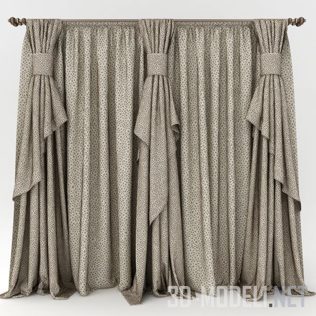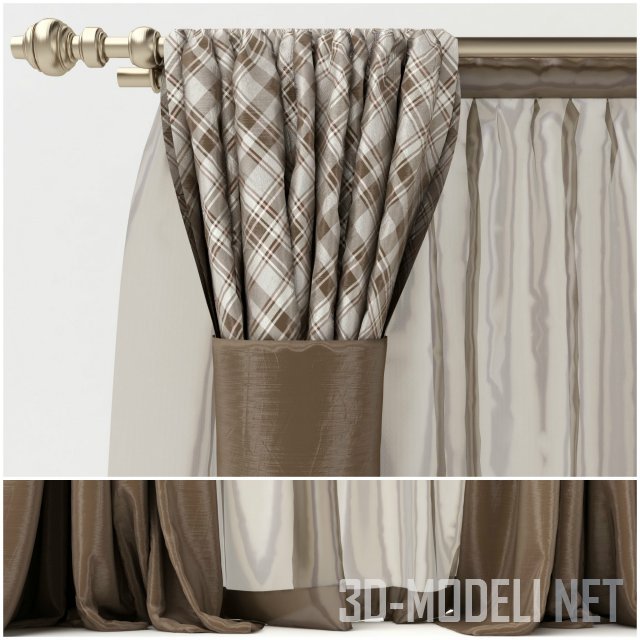 Декоративное решение для оформления окна, сложный комплект штор. Центральное полотно светлого цвета, с контрастной каймой внизу. Три перехваченные шторы цвета молочного шоколада равномерно расположены по карнизу. Элементы ткани в клетку хорошо гармонируют с основными шторами.