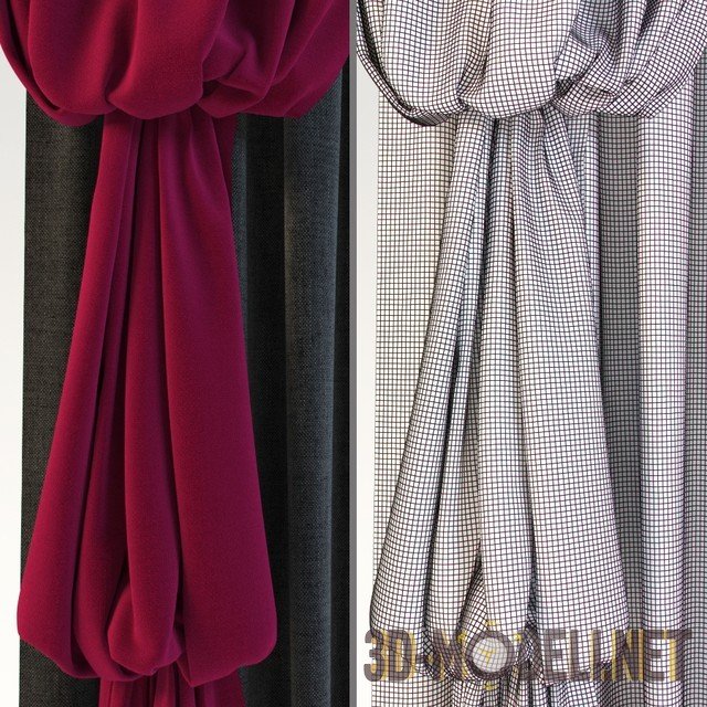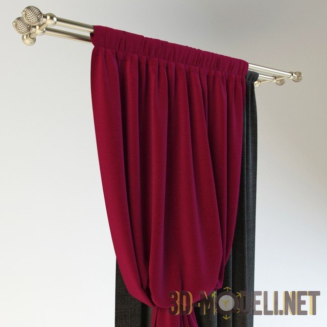3d-модель классической шторы на двойном золотистом карнизе. Одна штора прямая, темного оттенка, вторая имеет собранную форму, и красиво оттеняет первую. Вместе они создают изящный классический ансамбль, который очень украсит окно. С текстурами.