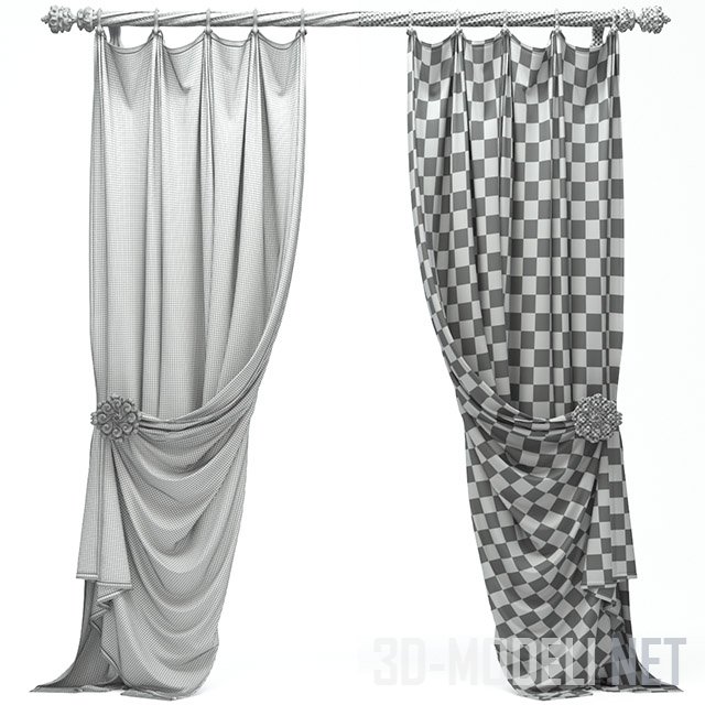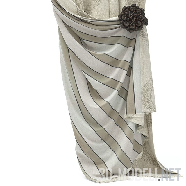 Витой карниз в классическом стиле, На карнизе всят две двусторонние шторы, темная и светлая с небольшим узором. Шторы отвернуты, на внутренней стороне ткань в легкую полоску. Прихвачены декоративной деталью в виде цветка.