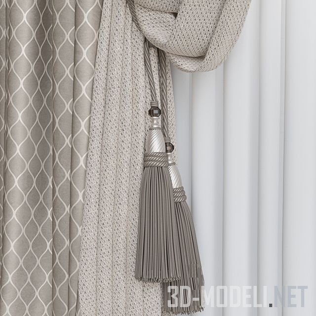 Набор штор (портьеры, римские шторы и тюль) для элегантного интерьера. Портьеры и римские предлагаются из двух видов ткани, с ромбовидным узором и гладкой бежевой. Оттенки тканей благородные, отлично сочетаются с белой тюлью. Портьеры подхвачены кистями.