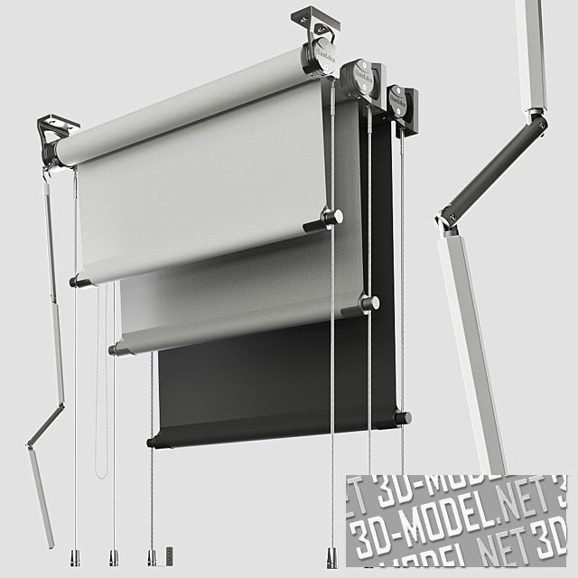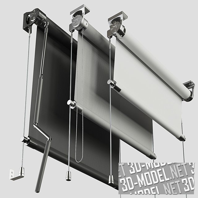 Современная система рулонных штор Bandalux с тремя типами механизмов. В данном случае представлены три цвета (черный, серый и белый) в следующих размерах: 120х35\60\80см; 90х35\60\80см; 60х35\60\80см. Фурнитура - хромированная.