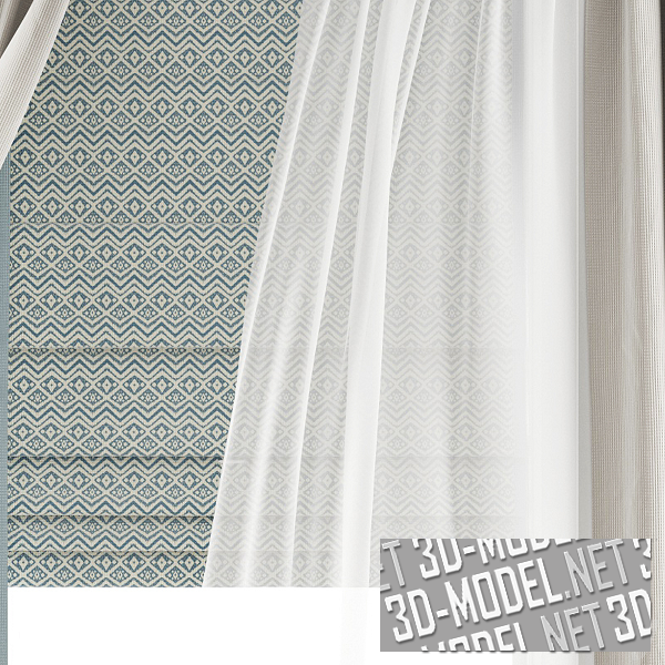 Комплект: шторы, ролеты и гардины в жемчужно-голубых тонах. Ткань ролет украшена мелким геометрическим орнаментом. Гардины - белые, полупрозрачные. Ночные шторы двух видов: жемчужного и приглушенного голубого цвета.