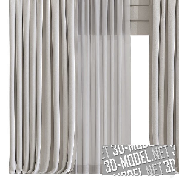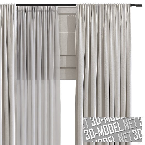 Комплект светлых штор: полупрозрачная гардина, два присборенных прямоугольных полотна ночных и горизонтальное прямоугольное полотно римской шторы в полусобранном положении. Двойной карниз - металлический, черный, с минималистичными наконечниками в виде небольших цилиндров.
