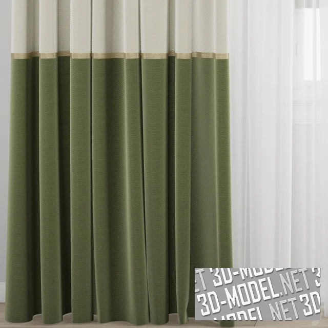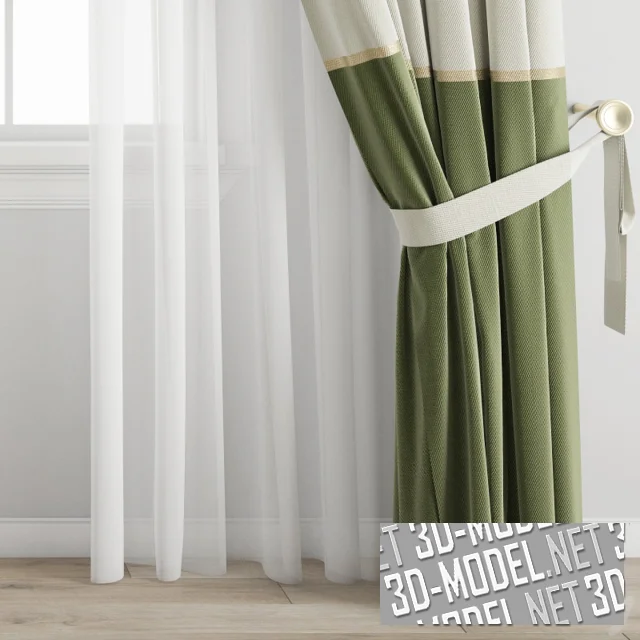 Современные шторы в сочетании белого и травянисто-зеленого цветов. В комплекте: зеленые римские шторы с темным контурным геометрическим орнаментом в современном стиле; белые полупрозрачные гардины; прямые полотна ночных штор, зеленые в нижней части и белые в верхней. Два цвета на полотне разделены горизонтальной золотистой лентой. Одно из полотен подхвачено широкой белой лентой и закреплено к декоративному кронштейну в стене.