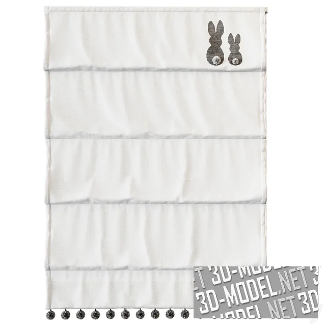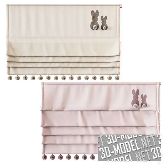 Набор римских штор для интерьера детской комнаты. Шторы выполнены из светлой ткани нюдовых оттенков с помпонами по нижнему краю. В верхнем углу - аппликация в виде двух очаровательных зайчиков. Ширина шторы составляет 1200 мм.