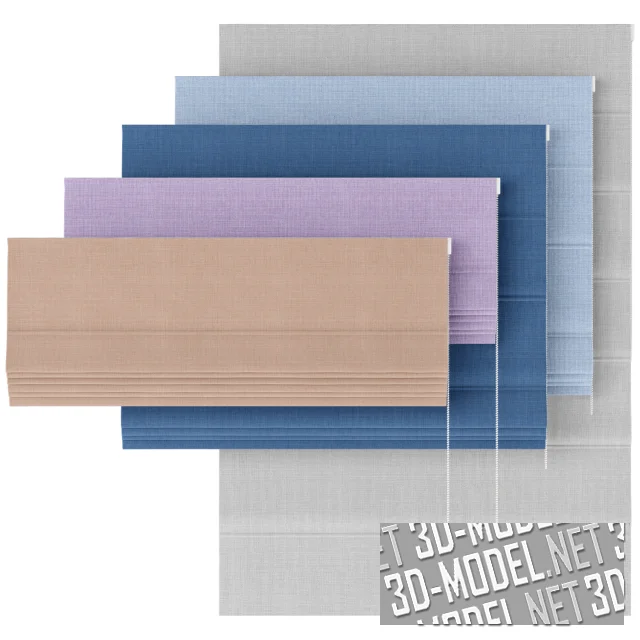 Коллекция современных римских штор Revati с полотнами из текстурированного текстиля и с белой фурнитурой. Ткань представлена в пяти цветах: бежевом, бледно-сиреневом, бледно-синем, светло-голубом и светло-сером. Ширина полотен - 120см. Модели в трех стадиях поднятия: раскрытая, на треть собранная, почти поднятая штора.