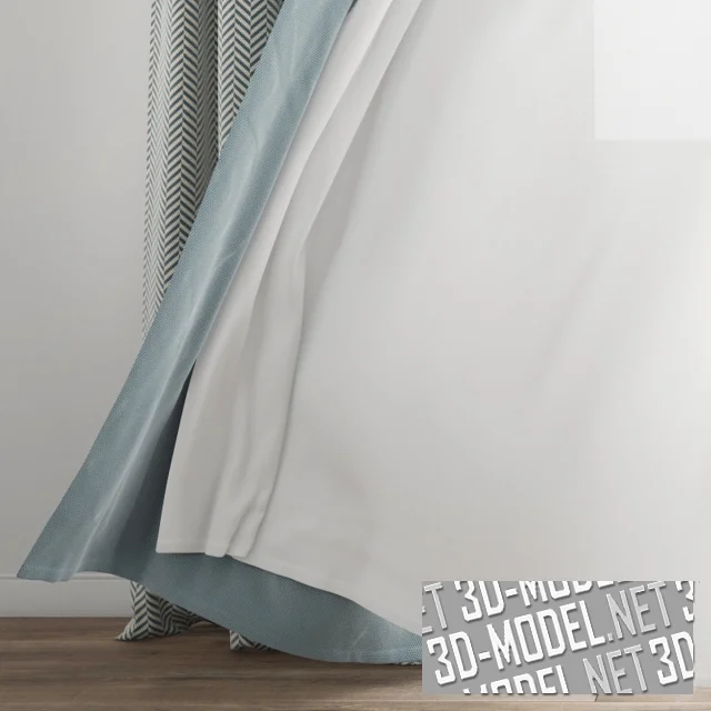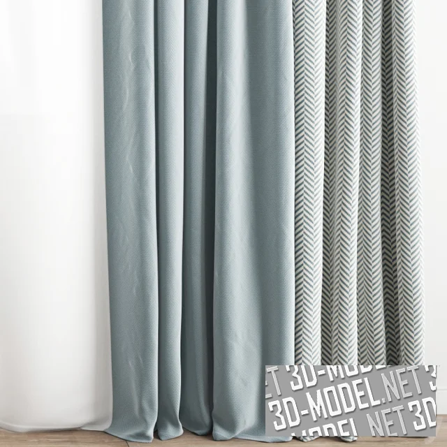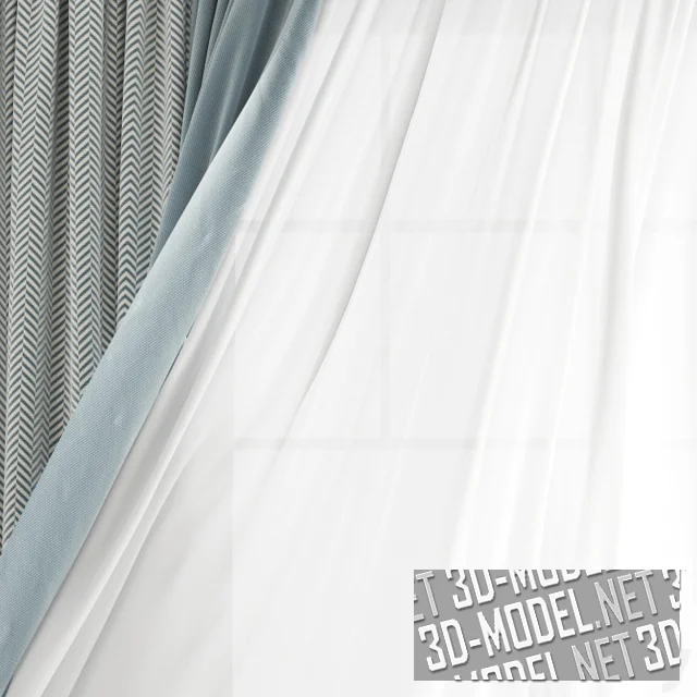 Комплект серо-голубых штор в современном стиле, с белыми гардинами и скрытым карнизом. Гардины и одно из полотен развеваются ветром из открытого окна. Шторные полотна из двух видов ткани: светло-голубые ближе к центру и в серо-голубую мелкую елочку по краям проема.