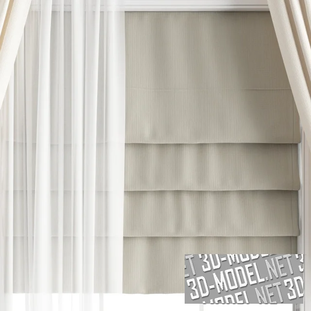 Легким и ненавязчивым, универсальным декоративным вариантом для окна станет этот комплект штор. Портьеры цвета шампанского и бледной оливки (римская тоже из этой ткани) прекрасно сочетаются с белоснежной тюлевой шторой.