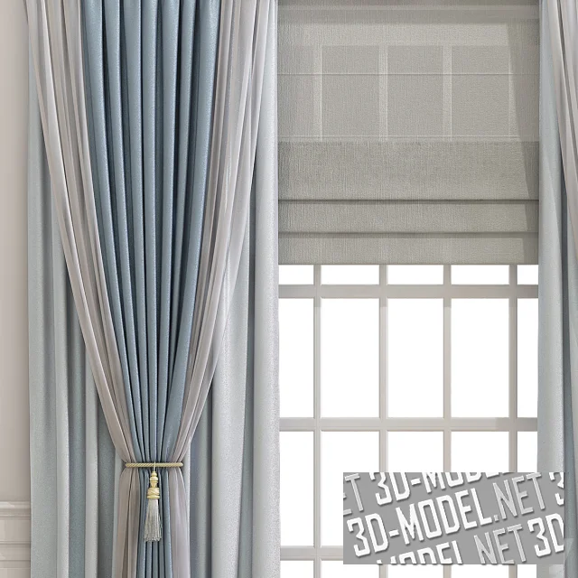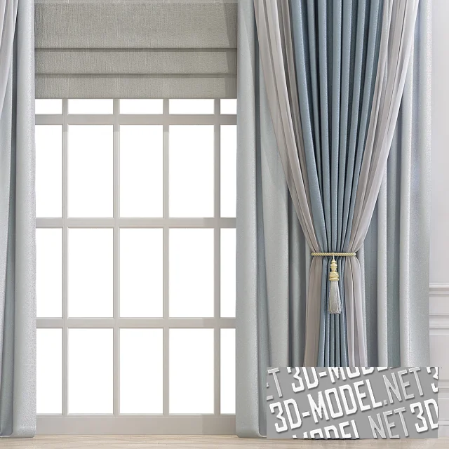 Изысканный набор для современного интерьера. В комплект входят занавески от светлого нежно-голубого до более насыщенного цвета и серая римская штора, которую можно опустить по всей длине окна. Такие оттенки придают пространству больше легкости и воздушности.