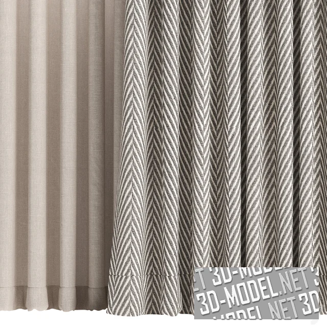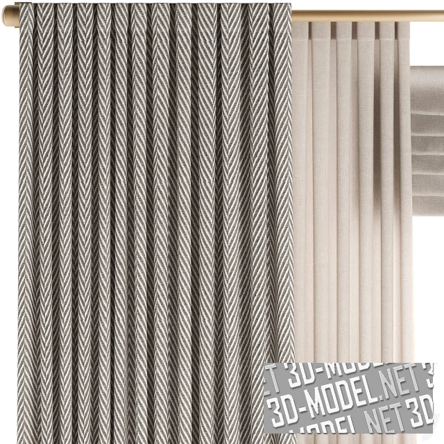 Универсальный комплект оконных штор на деревянном карнизе. В набор входят плотные и легкие занавески, римская штора посередине. Портьеры выполнены с интересным «елочным» узором. Тюлевая и римская занавески – однотонные (цвет капучино).