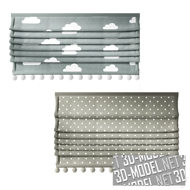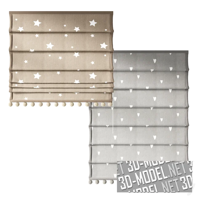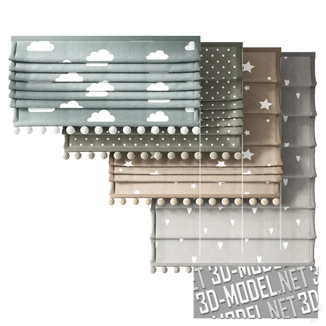Набор римских штор в детскую комнату. Интересным декоративным дополнением служат нарисованные сердечки, звездочки, тучки и забавные мягкие помпоны. Можно выбрать любой из представленных вариантов в зависимости от индивидуального интерьерного решения. Ширина штор 1200 мм.