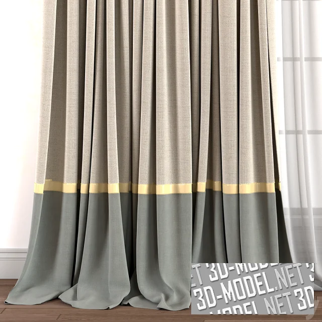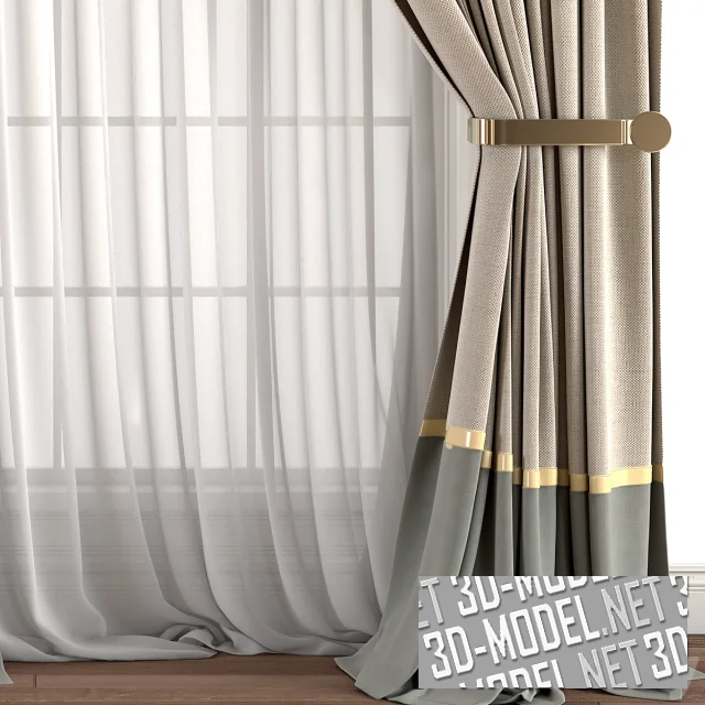 Комплект современных штор с прямыми присобранными полотнами и белой полупрозрачной гардиной. Полотна штор комбинированные. Основная часть - крупнотекстурная ткань цвета льняного холста. Внизу широкая полоса серого цвета, отделенная узкой золотистой лентой. Правое полотно штор подхвачена золотистым металлическим элементом в виде пластины с кругом на конце.