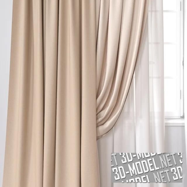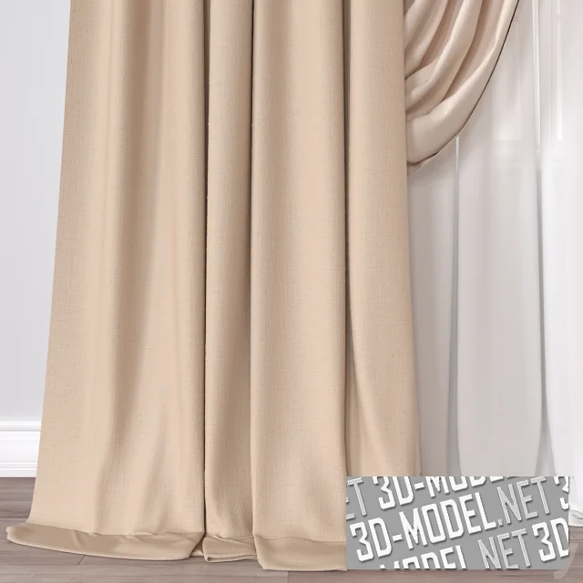 Комплект классических штор в кремовых тонах. Полотна переднего плана выполнены из тканей двух тонов кремового цвета - темные по краям, а светлые внутри. Внутренние полотна подхвачены в нижней трети и мягкими складками создают рисунок кулис. На втором слое висят два полотна белых полупрозрачных гардин.