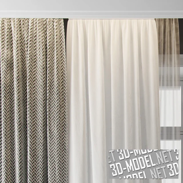 Набор современных универсальных штор. В комплект входят: плотная серая с елочным узором, средней плотности белая и полупрозрачная тюлевая занавески. Такое разнообразие позволяет обеспечить легкое и полное притенение, в зависимости от предпочтений.