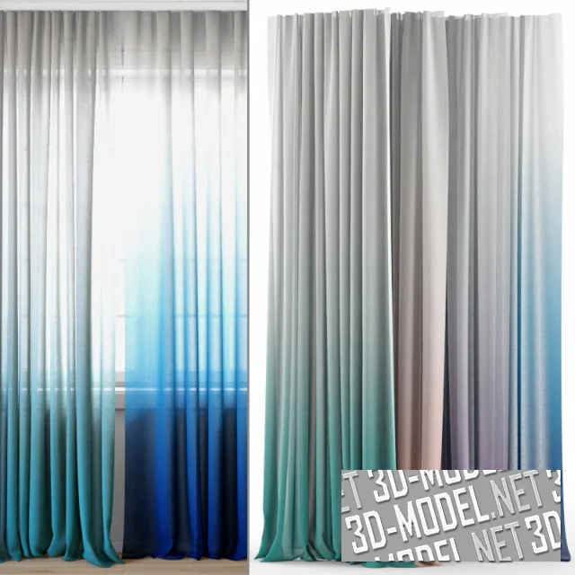 Несколько цветовых вариантов занавесок от Pottery Barn Teen, серия Ombre. Прозрачная ткань штор позволяет красиво переливаться градиенту в оттенках голубого, синего, лаванды. Высококачественная трехмерная модель, выполненная с большим вниманием к деталям. С текстурами и материалами Vray.