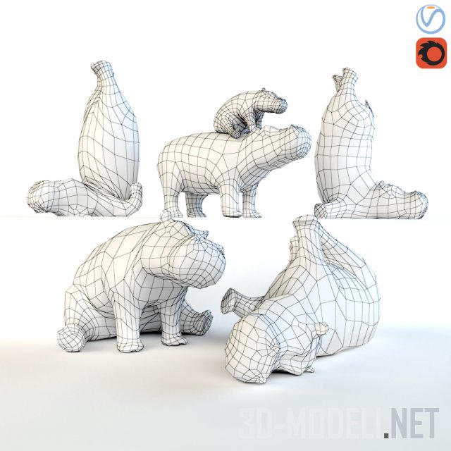 Керамические фигурки бегемотов в различных позах. Красная, сиреневая, серая, желтая или зеленая фигурка в глянцевом блеске будет забавно и мило смотреться в интерьере. Низкополигональная модель.