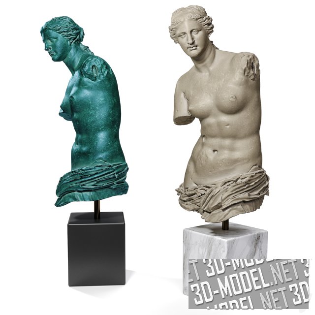 Два варианта скульптуры, с изображением фрагмента Венеры Милосской (по бедра). Фигуры смонтированы на стойке с основанием в виде куба из черного материала и из белого с серыми прожилками мрамора. На черном основании - античная фигура - бронзовая, с темно-бирюзовой патиной. На бело-сером - гипсовая, цвета слоновой кости. Габарит скульптуры: 25х26х74см.