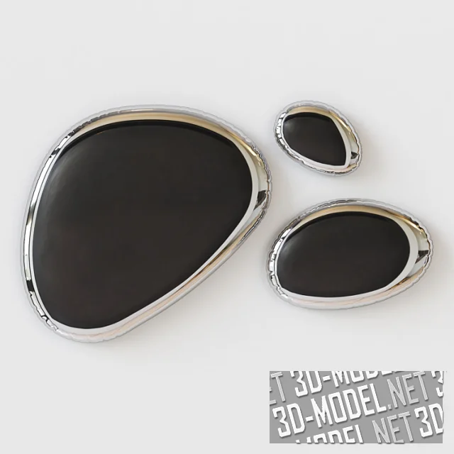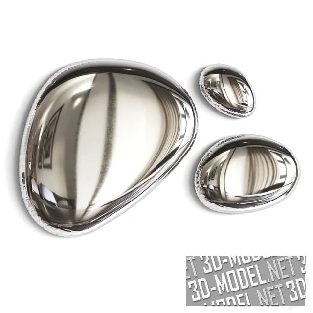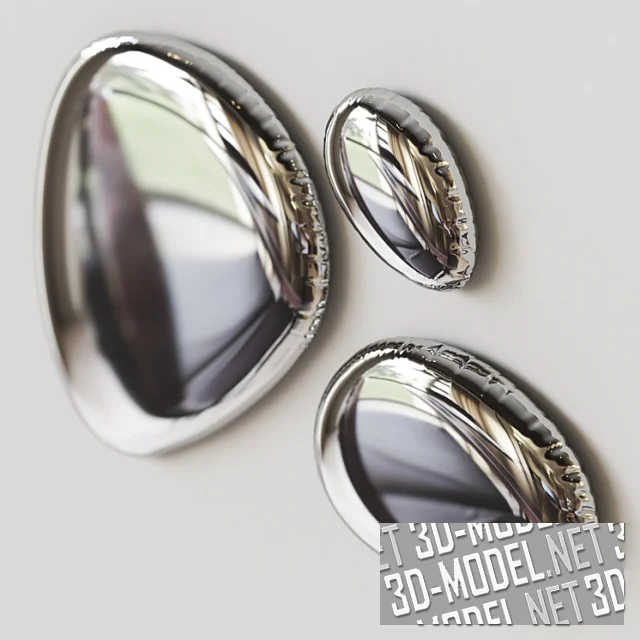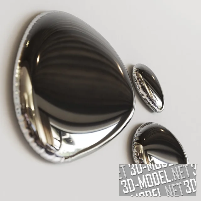 Декоративные зеркальные настенные скульптуры Tafla от Zieta Studio, сделаны из полированного металла. Три разновеликие криволинейные обтекаемые объемные формы напоминают капли ртути. Небольшие искусственные деформации по периметрам добавляют абстрактным «каплям» дополнительную декоративность.