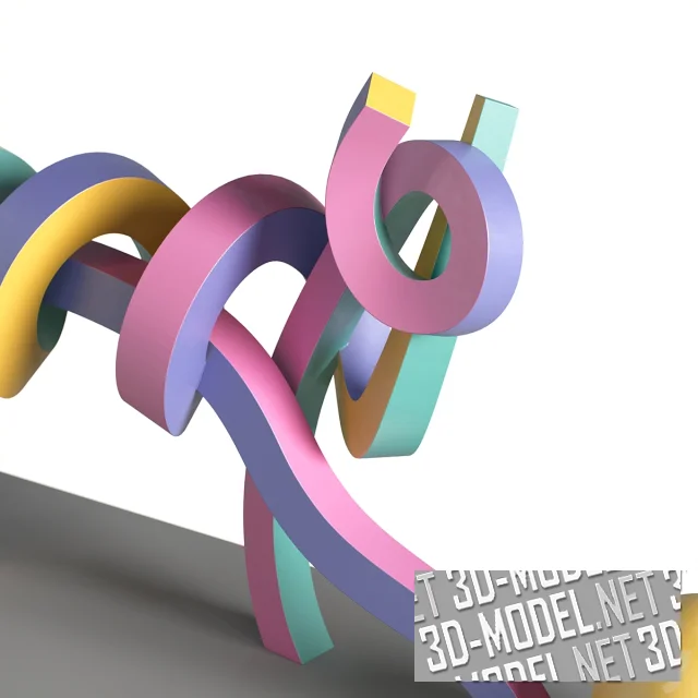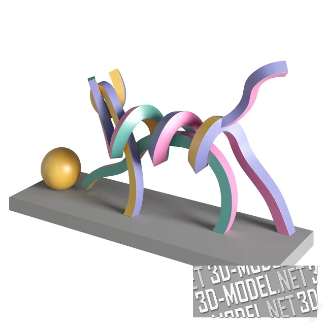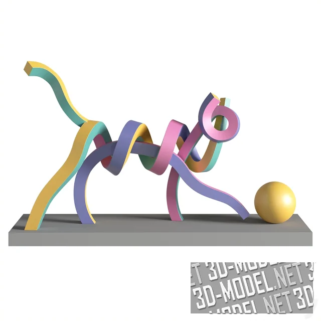 Современная настольная фигурка на прямоугольной серой подставке «Cat With A Ball» (дизайнер: Lee Sangsoo). Стилизованное, абстрактное изображение животного выполнено из гнутых и завитых брусков. Плоскости деталей раскрашены пастельными тонами: бледно-желтым, розовым, сиреневым, мятным. Мяч - бледно-желтый.
