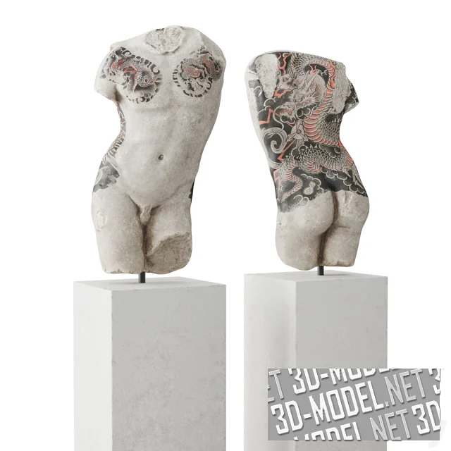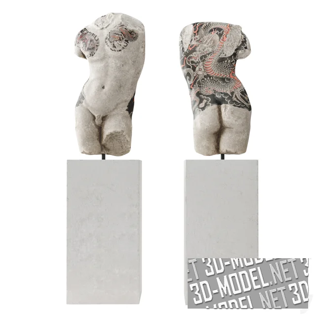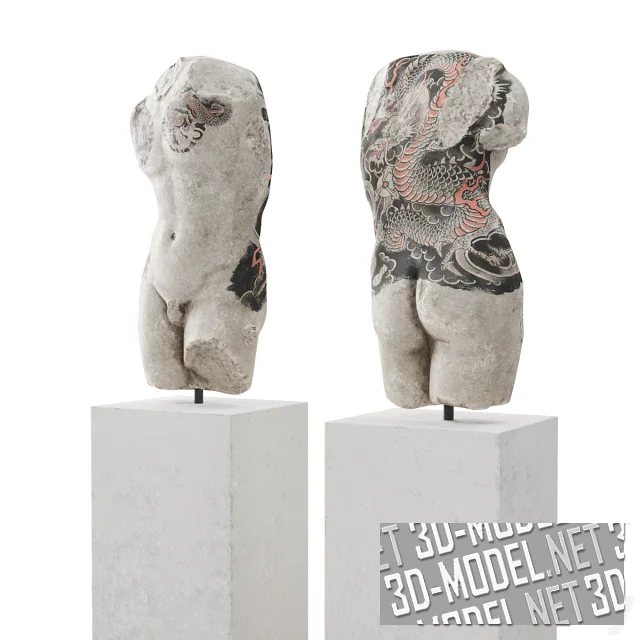 Предмет современного искусства, объединивший античный мужской торс из состаренного мрамора с японскими татуировками якудзы, изображающими черно-красных драконов. Скульптура закреплена на белом бетонном прямоугольном блоке постамента. Габарит торса: 34х32х67см. Габарит блока постамента: 32х32х65см.